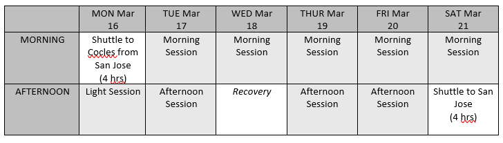 - DEPARTURE: A shuttle will be arranged for Saturday, March 21h late afternoon/evening heading to San Jose from Cocles.